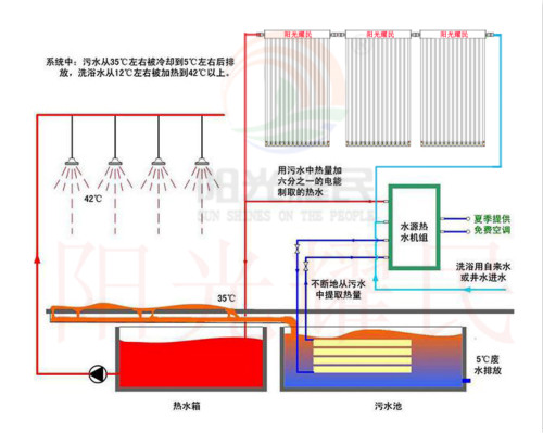 《洗浴排水熱能回收系統(tǒng)》是一項(xiàng)采用太陽(yáng)能+熱泵,回收洗浴后的廢水中熱能的技術(shù)。_高溫洗浴熱泵回收低溫余熱,利用這一新的技術(shù)代替?zhèn)鹘y(tǒng)加熱方法,能夠減少燃煤對(duì)大氣的污染,節(jié)約大量不可_能源。