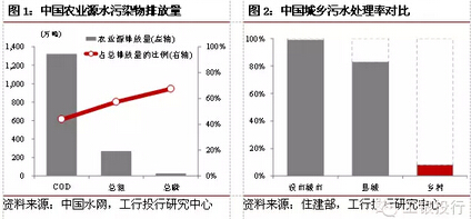 2. 上山下鄉(xiāng),到農(nóng)村去長期以來,在我國農(nóng)業(yè)領(lǐng)域的環(huán)保問題一直沒有得到充分的重視,但實際上這一領(lǐng)域的污染問題已經(jīng)相當(dāng)突出。在水體污染方面,目前農(nóng)業(yè)源占我國COD排放量的比例_過40%,占總氮排放的比例在60%左右,占總磷排放的比例_是高達70%左右。目前我國農(nóng)業(yè)水污染治理程度嚴重偏低,還處于起步階段。據(jù)統(tǒng)計,我國僅北京、天津、上海、江蘇、浙江、廣東等少數(shù)發(fā)達省市的農(nóng)村生活污水處理率能夠_過10%,其他大部分省份還未全面鋪開。在我國環(huán)境承載能力日益逼近上限的現(xiàn)狀下,農(nóng)村環(huán)境治理問題開始受到高層重視,近年來,國務(wù)院、環(huán)保部、財政部、發(fā)改委在多個文件中均重點提及,而農(nóng)業(yè)部近日下發(fā)的《關(guān)于打好農(nóng)業(yè)面源污染防治攻堅戰(zhàn)的實施意見》_是給出了一個較為全面的實施路線圖。